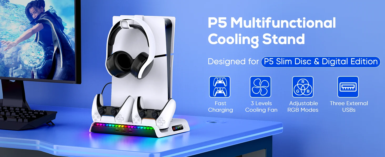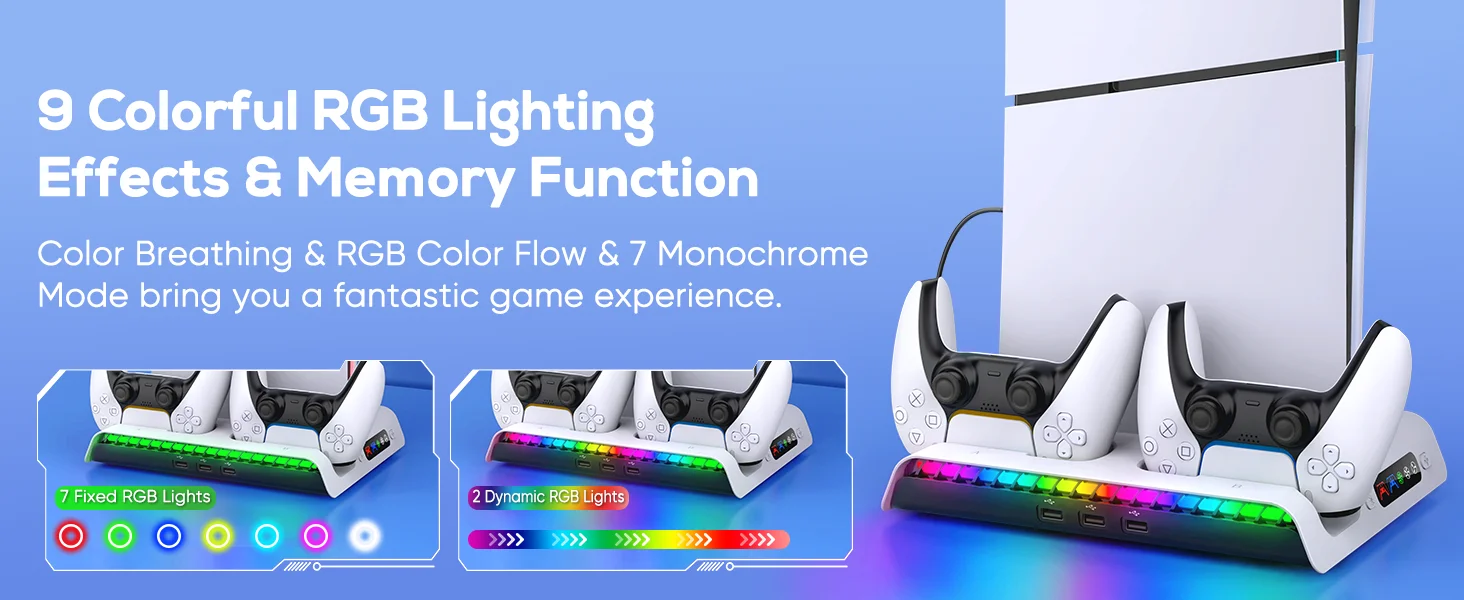 🌀【RGB Charging Stand for PS5 Slim Console】The cooling stand for PS5 slim console is specially designed for PlayStation5 Slim Digital & Discs Edition, The charging station for PS5 slim equipped with dual controller charging port can charge for DualSense controllers, also for dualSense edge controllers. And the same color as the ps5 slim console, is the best replacement for official vertical base stand. (Note: Please set the USB ports of the console for PS5 to always supply power mode).