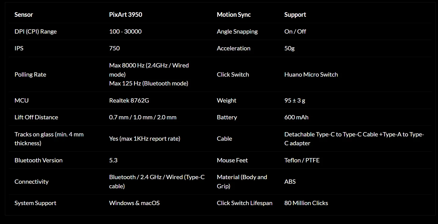 Huano 80M micro switch deliver clean clicks feeling, and the lifespan is up to 80 million clicks